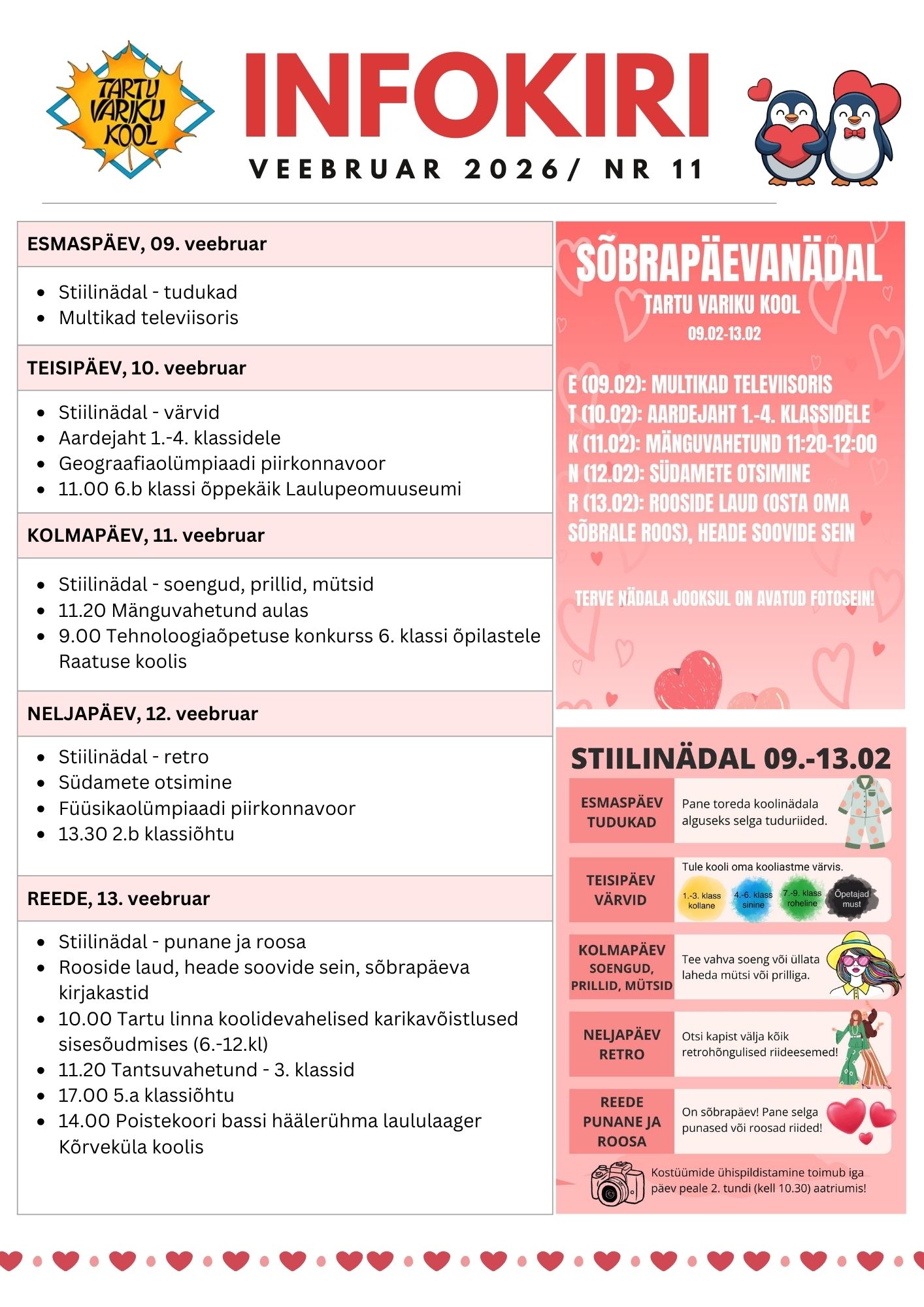 Eesti kirjanduse ja kooslugemise päev meie koolis Loomise kuupäev 09.02.2026 Autor Deivi Suiste 02.-06. veebruar infokiri Loomise kuupäev 02.02.2026 Autor Deivi Suiste Külalistund Euroopa Parlamendi saadiku Jüri Ratasega Loomise kuupäev 02.02.2026 Autor Deivi Suiste Tublid tulemused inglise keele õpilasvõistlusel! Loomise kuupäev 02.02.2026 Autor Deivi Suiste Vaata rohkem