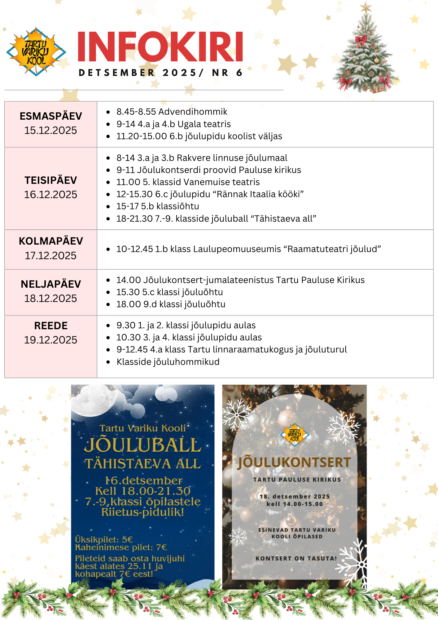 08.-14. detsember infokiri Loomise kuupäev 08.12.2025 Autor Deivi Suiste 01.-05. detsember infokiri Loomise kuupäev 01.12.2025 Autor Deivi Suiste Esimeste klasside aabitsapidu Loomise kuupäev 01.12.2025 Autor Deivi Suiste 24.-30. november infokiri Loomise kuupäev 24.11.2025 Autor Deivi Suiste Vaata rohkem
