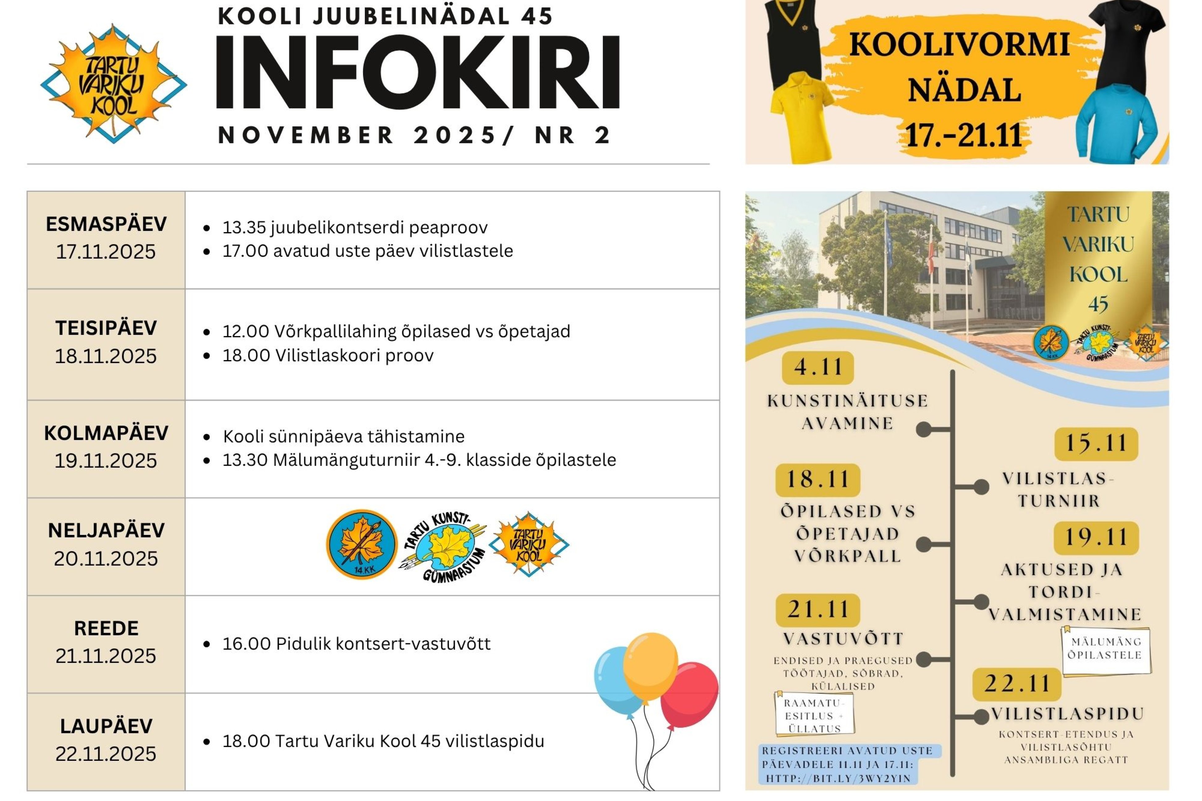 10.-16. november infokiri Loomise kuupäev 10.11.2025 Autor Deivi Suiste Vilistlaste kunstitööde näitus Loomise kuupäev 07.11.2025 Autor Deivi Suiste 11. Varivalimised Loomise kuupäev 07.11.2025 Autor Deivi Suiste MÄMU uus hooaeg Loomise kuupäev 07.11.2025 Autor Deivi Suiste Vaata rohkem