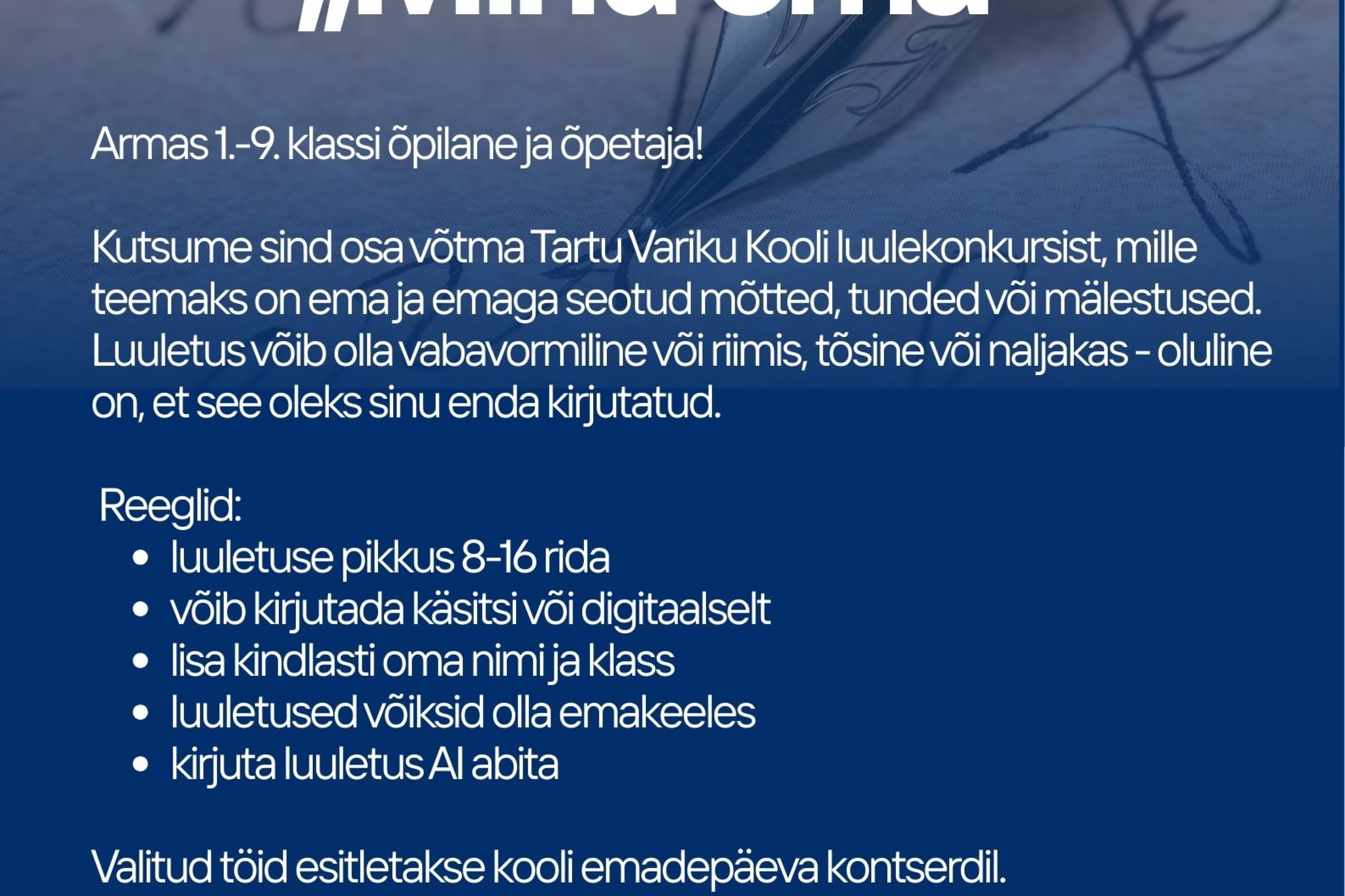 Kutsume sind osa võtma Tartu Variku Kooli luulekonkursist, mille teemaks on ema ja emaga seotud mõtted, tunded või mälestused. Luuletus võib olla vabavormiline või riimis, tõsine või naljakas - oluline on, et see oleks sinu enda kirjutatud.