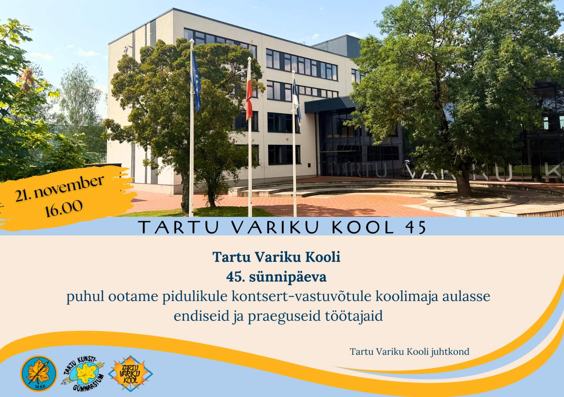 Tartu Variku Kooli 45. sünnipäeva puhul ootame pidulikule kontsert-vastuvõtule koolimaja aulasse endiseid ja praeguseid töötajaid