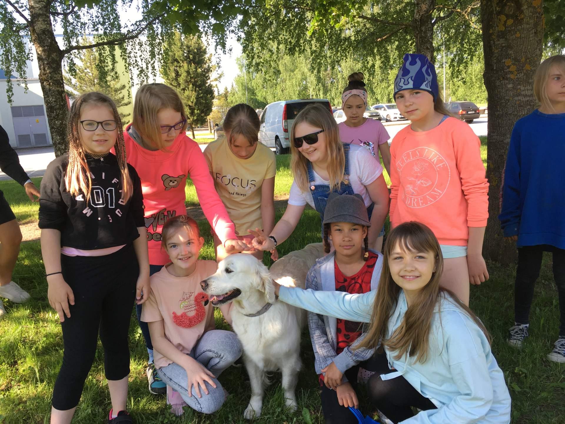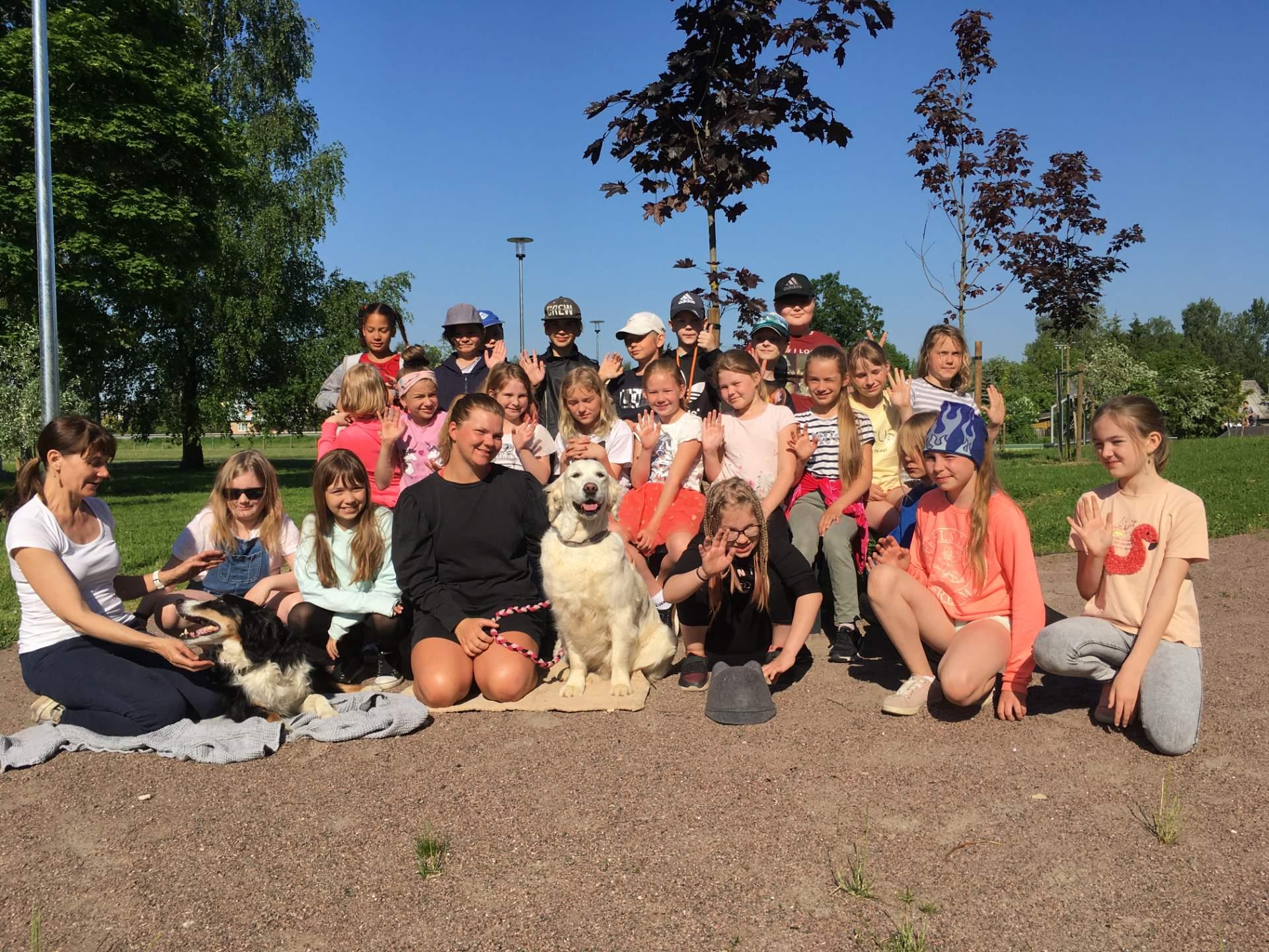 Kohtume koolimaja küljel muruplatsil 7. juunil kell 8.15 kus on vahtrapuud. Istusime mattidel ringis murul ja koertega kohtumiseks võtsime kivikujud, et koerad saaks meiega harjuda ja meie nendega. Koerte õpetajad ütlesid, et ka võõras seltskonnas esmalt tutvutakse ja loetakse kehakeelt. Nad ütlesid, et lausa 80% infost võib edasi anda kehakeeles.