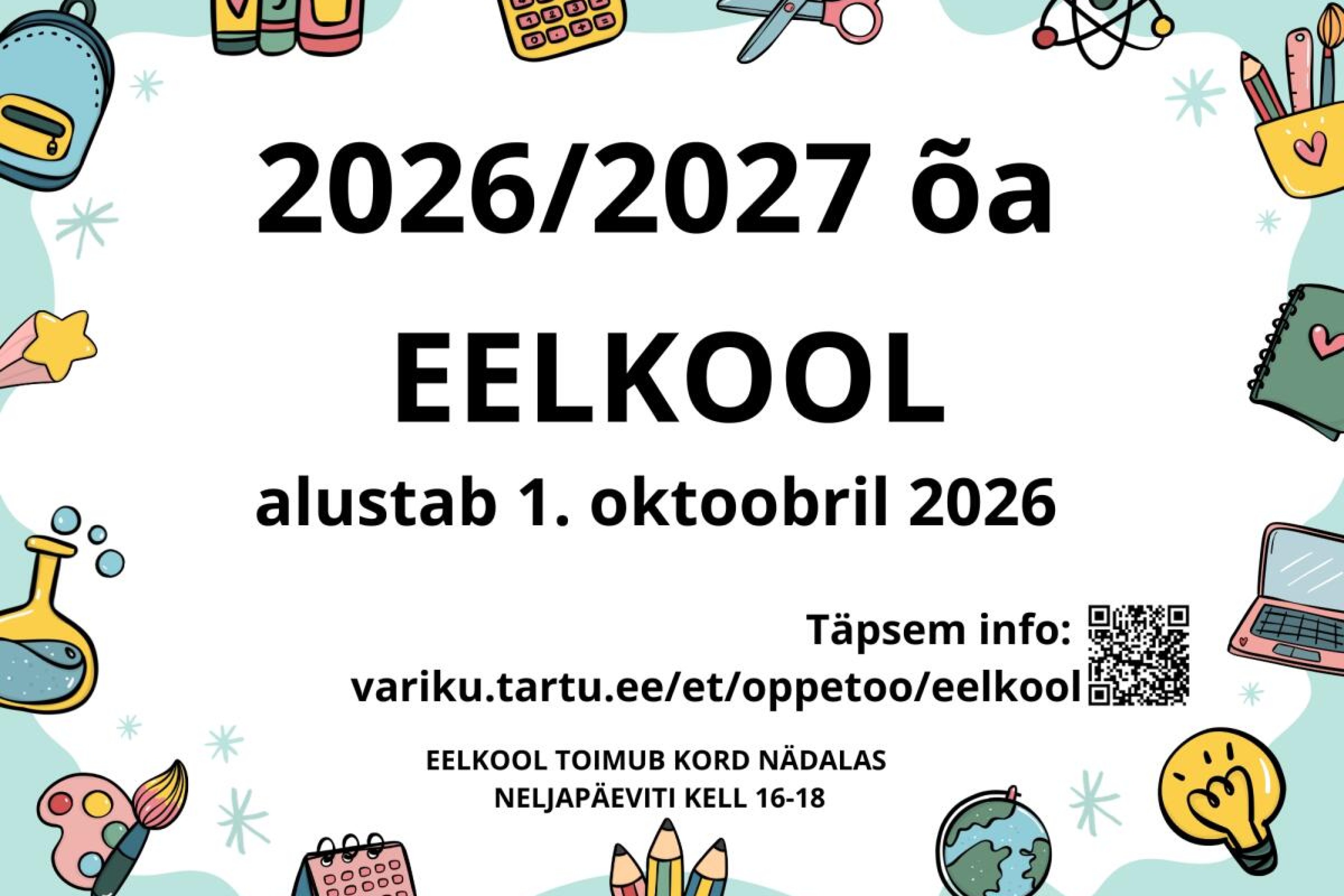Õppetöö eelkoolis toimub 1.10.2026 - 22.04.2027 (25 korda) neljapäeviti kell 16.00 - 18.00.