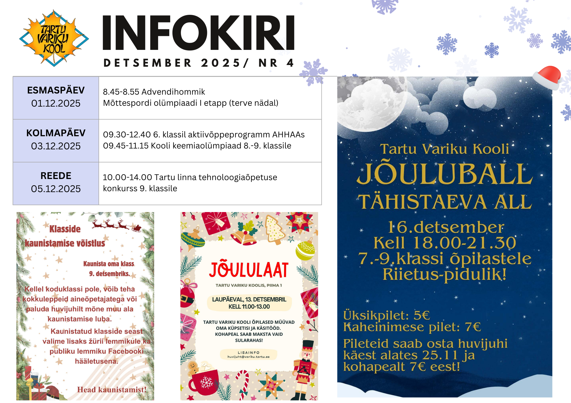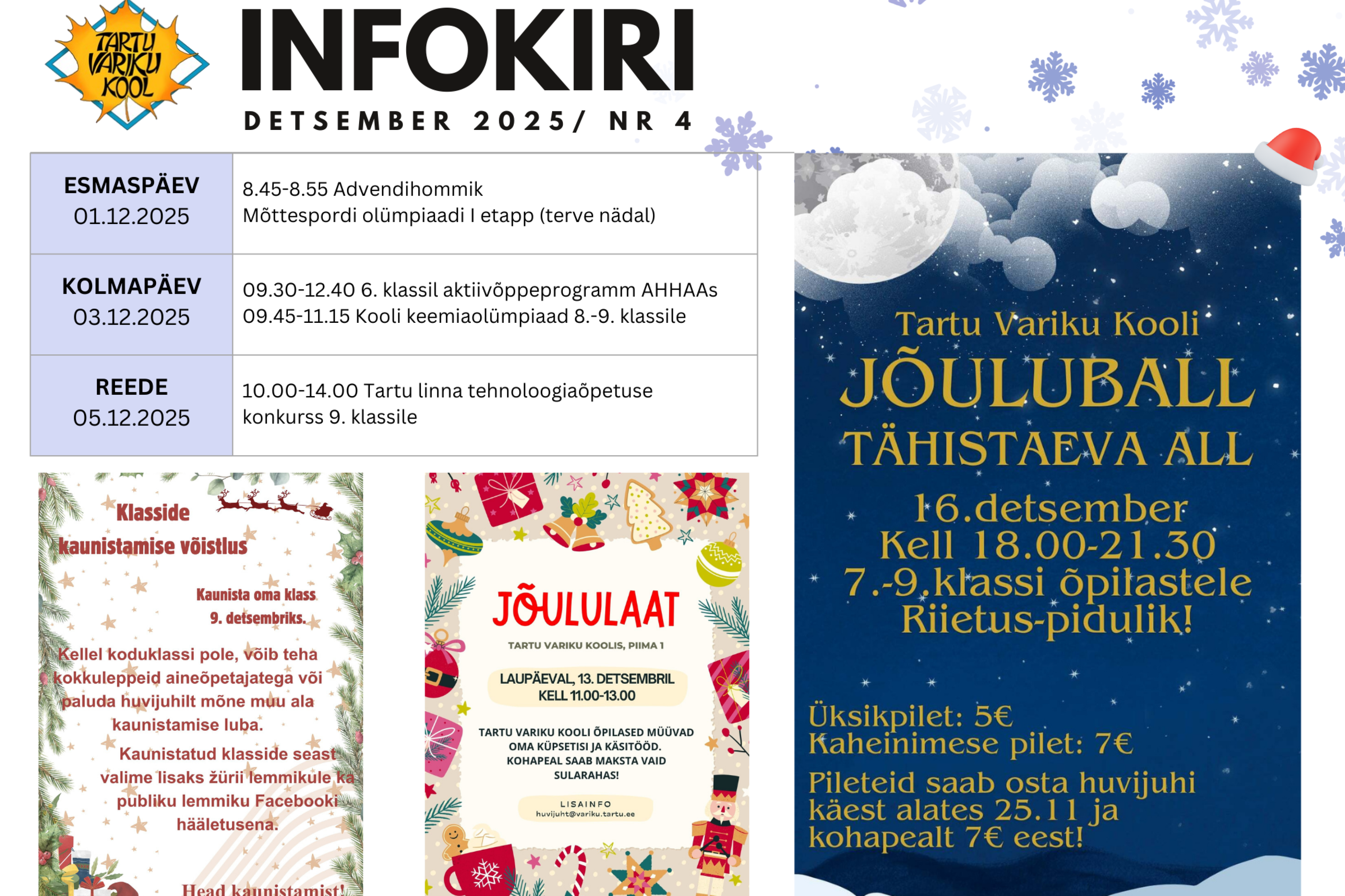 Esimeste klasside aabitsapidu Loomise kuupäev 01.12.2025 Autor Deivi Suiste 24.-30. november infokiri Loomise kuupäev 24.11.2025 Autor Deivi Suiste 17.-23. november infokiri Loomise kuupäev 17.11.2025 Autor Deivi Suiste 10.-16. november infokiri Loomise kuupäev 10.11.2025 Autor Deivi Suiste Vaata rohkem