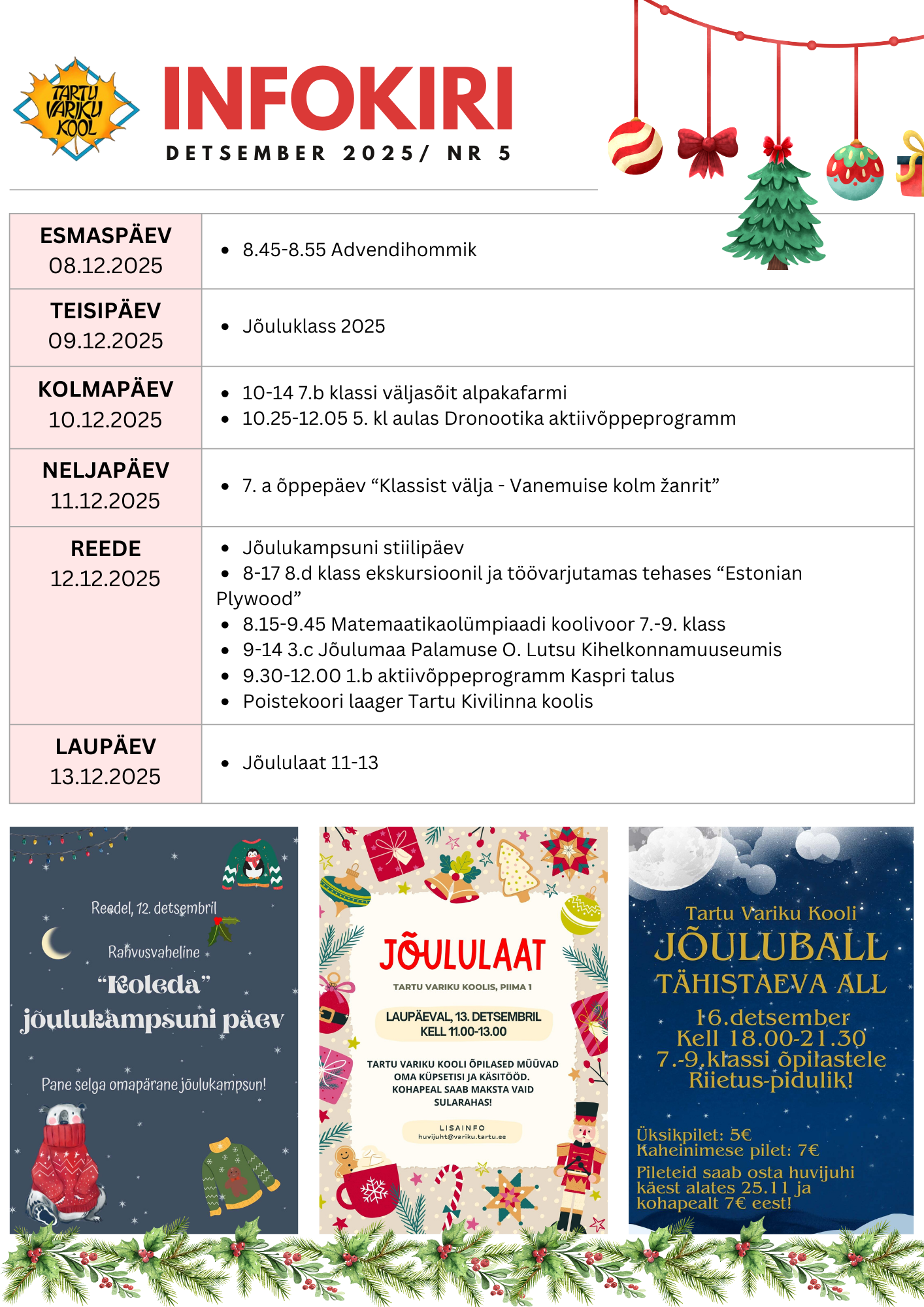 01.-05. detsember infokiri Loomise kuupäev 01.12.2025 Autor Deivi Suiste Esimeste klasside aabitsapidu Loomise kuupäev 01.12.2025 Autor Deivi Suiste 24.-30. november infokiri Loomise kuupäev 24.11.2025 Autor Deivi Suiste 17.-23. november infokiri Loomise kuupäev 17.11.2025 Autor Deivi Suiste Vaata rohkem