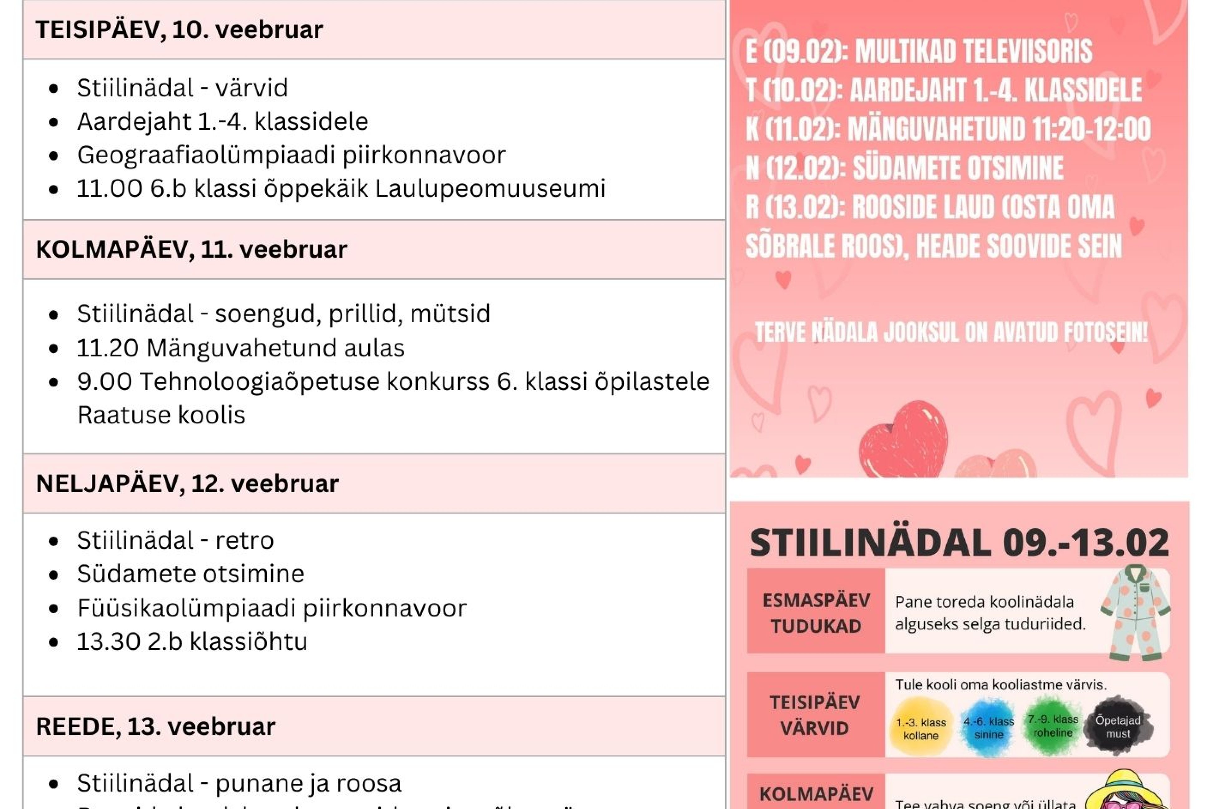 Eesti kirjanduse ja kooslugemise päev meie koolis Loomise kuupäev 09.02.2026 Autor Deivi Suiste 02.-06. veebruar infokiri Loomise kuupäev 02.02.2026 Autor Deivi Suiste Külalistund Euroopa Parlamendi saadiku Jüri Ratasega Loomise kuupäev 02.02.2026 Autor Deivi Suiste Tublid tulemused inglise keele õpilasvõistlusel! Loomise kuupäev 02.02.2026 Autor Deivi Suiste Vaata rohkem