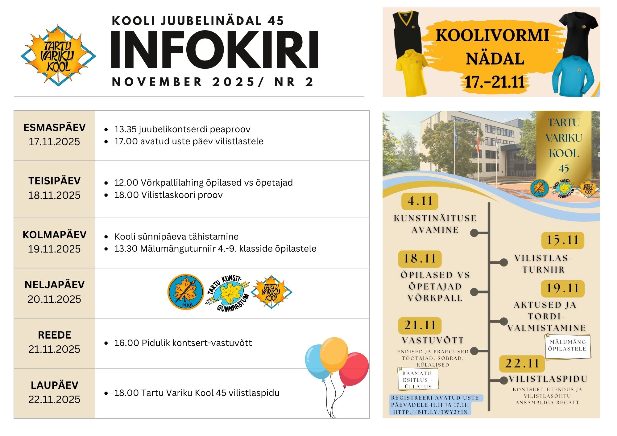 10.-16. november infokiri Loomise kuupäev 10.11.2025 Autor Deivi Suiste Vilistlaste kunstitööde näitus Loomise kuupäev 07.11.2025 Autor Deivi Suiste 11. Varivalimised Loomise kuupäev 07.11.2025 Autor Deivi Suiste MÄMU uus hooaeg Loomise kuupäev 07.11.2025 Autor Deivi Suiste Vaata rohkem