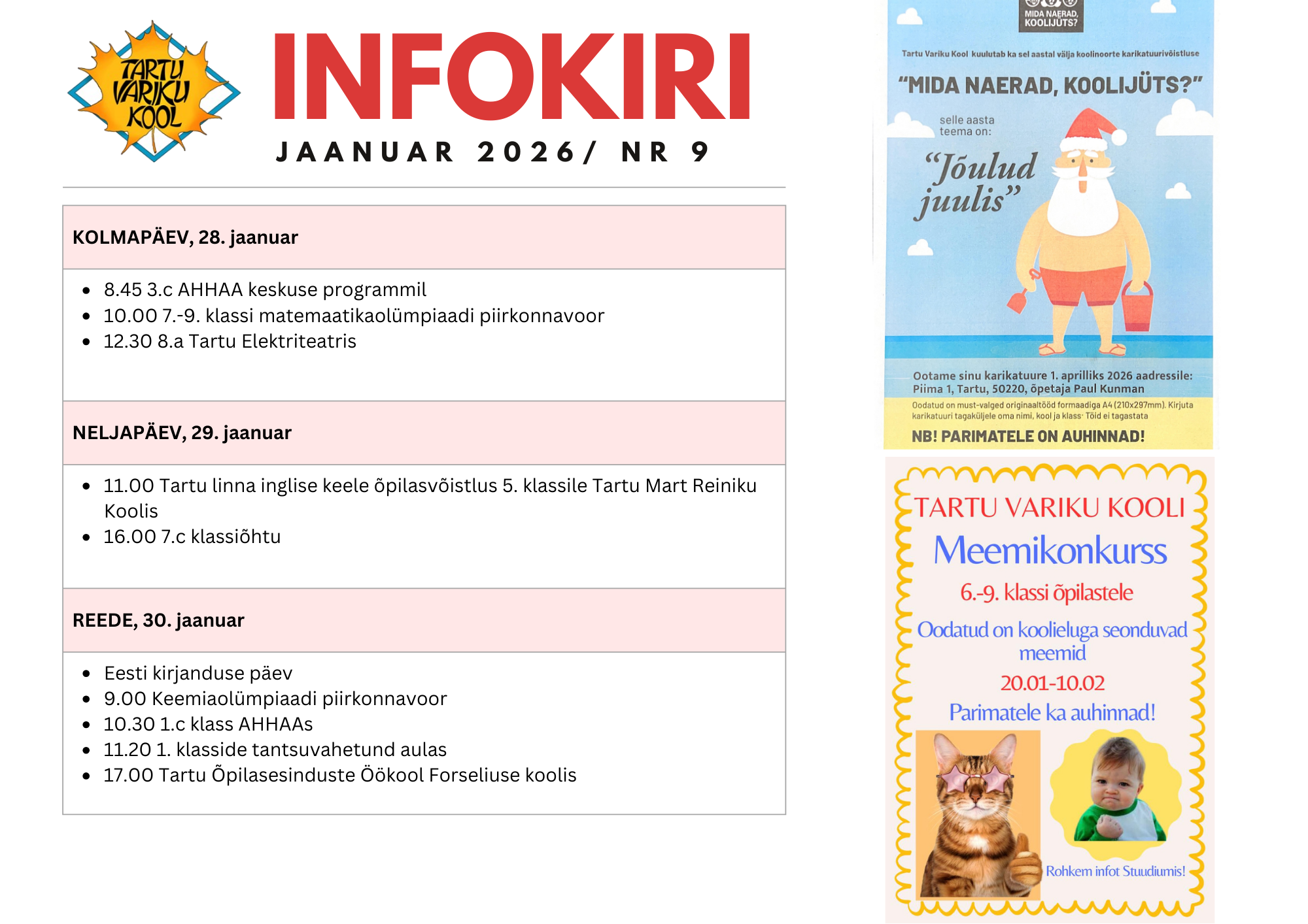 Emakeelepäeva viktoriin Loomise kuupäev 13.03.2026 Autor Deivi Suiste English Whizz Award 2026 Loomise kuupäev 12.03.2026 Autor Deivi Suiste Suurepärane tulemus pioneeripalli võistlusel Loomise kuupäev 12.03.2026 Autor Deivi Suiste Suurepärased tulemused tehnoloogiaõpetuse konkursilt Loomise kuupäev 12.03.2026 Autor Deivi Suiste Vaata rohkem