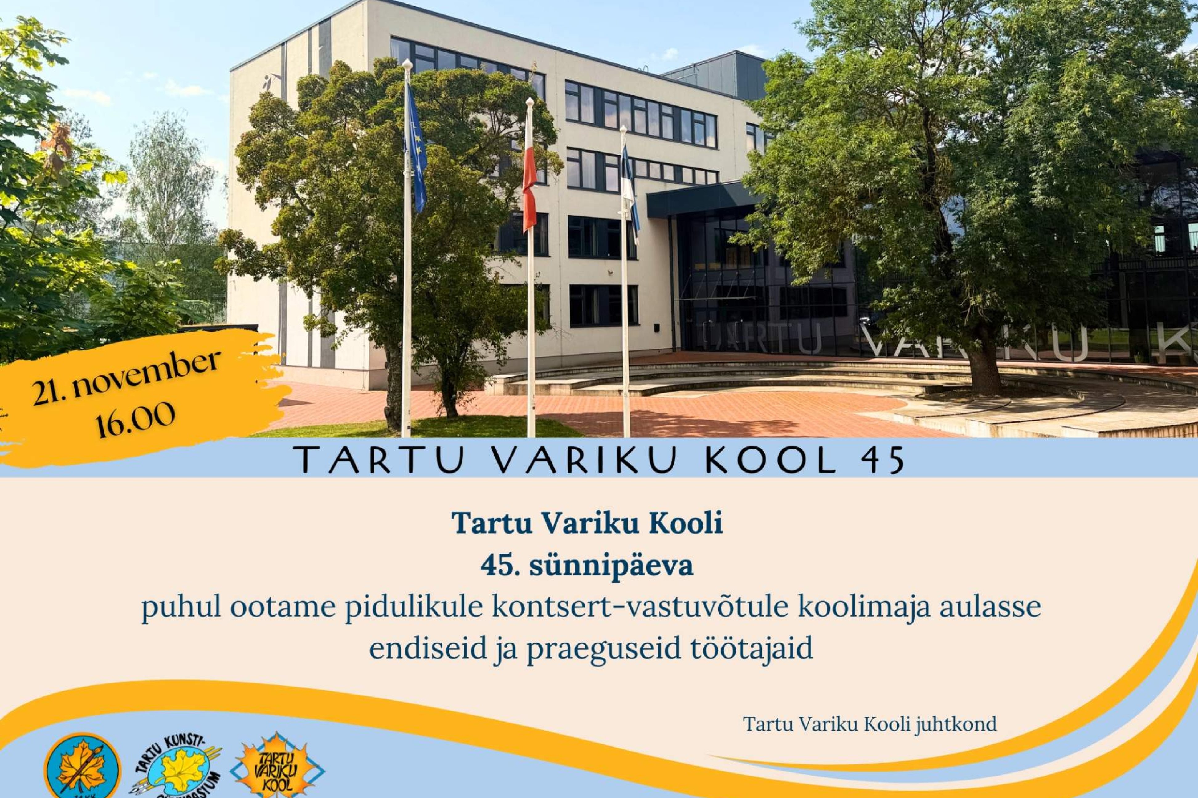 Tartu Variku Kooli 45. sünnipäeva puhul ootame pidulikule kontsert-vastuvõtule koolimaja aulasse endiseid ja praeguseid töötajaid